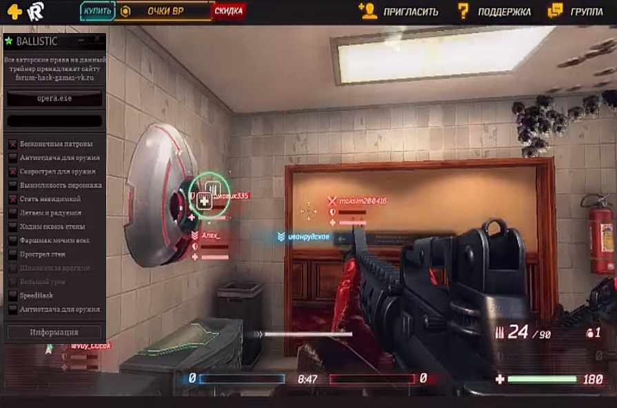 Обновлённый чит на ballistic 2017 года включил в себя пару новых функций: бесконечная выносливость перса и анти отдача. Помимо этих опций, в вк чите есть: