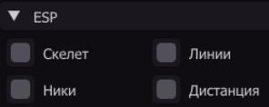 - ESP - стандартный набор инфы: health, distance, lines, nicknames + выбор цвета для всего.