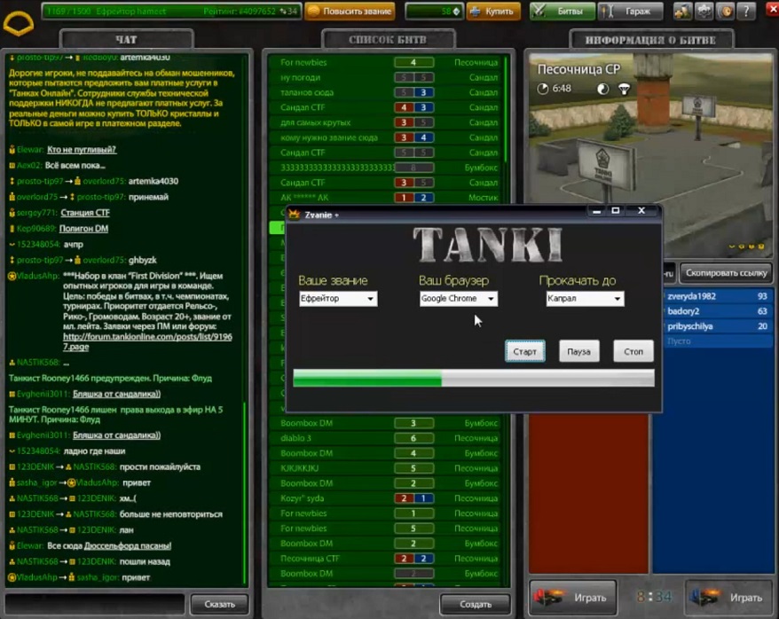 В сети появилась программа, которая облегчает прокачку и подъём в топы. Называется эта прога: читы на ранг в танки онлайн. С её помощью вы быстро качнёте свой аккаунт от новобранца до легенды. Достаточно будет просто выбрать желаемое звание и сыграть один бой. Кстати, этот софт на звание является рабочим аналогом чита на опыт, просто имейте это ввиду.